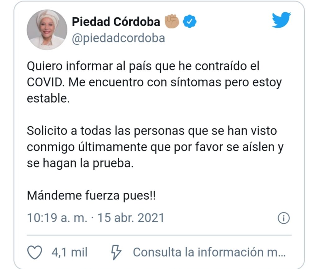 Se sabe que Piedad se encuentra estable y aislada cumpliendo con los protocolos sanitarios, por otra parte recomendó a sus conocidos y allegados a practicarse la prueba para prevenir mayores contagios.