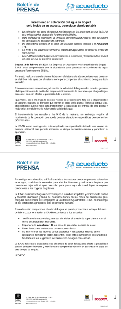 La EAAB a través de un comunicado de prensa manifestó qué: «El incremento en coloración del agua en Bogotá solo incide en su aspecto, pero sigue siendo potable.«