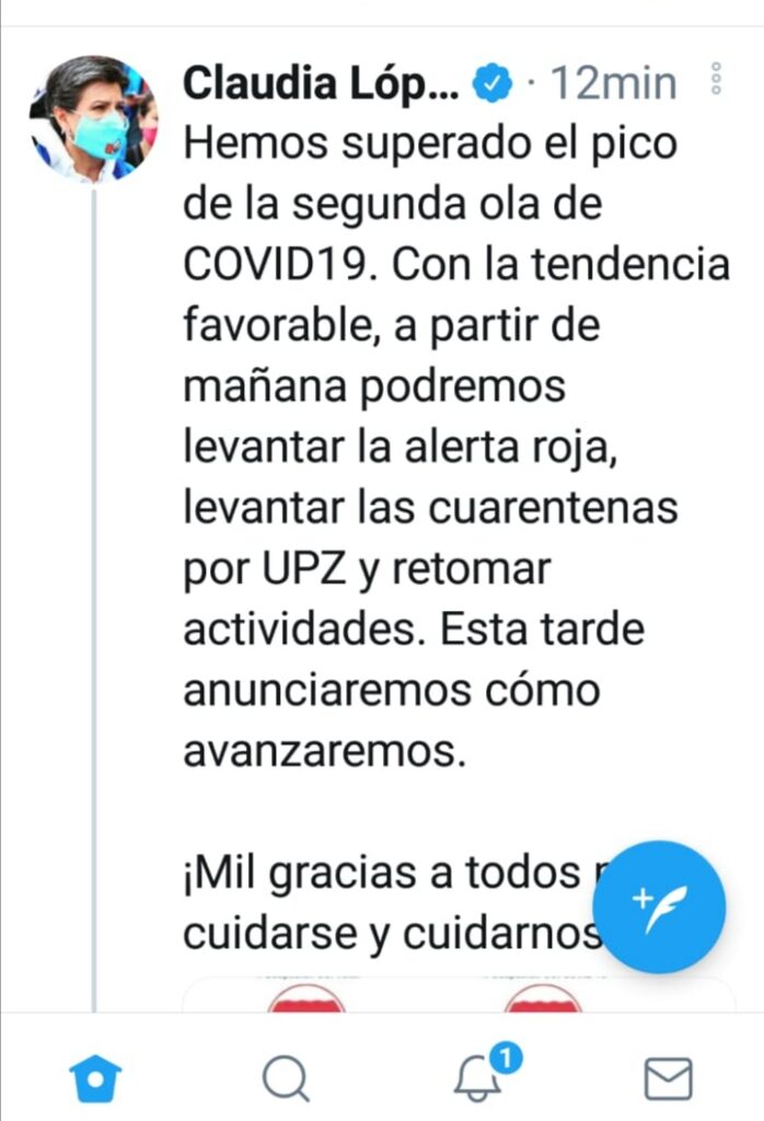La mandataria Distrital Claudia López, ha venido informando que el segundo pico del Coronavirus Covid 19 en la capital del país ha ido disminuyendo, una noticia positiva para las estadísticas y el control epidémiológico. Lo que llevaría al posible levantamiento de la cuarentena que vive Bogotá decretado hasta el 12 de febrero del presente año.