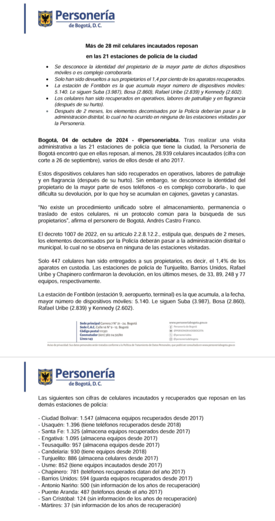 Tras realizar una visita administrativa a las 21 estaciones de policía que tiene la ciudad, la Personería de Bogotá encontró que en ellas reposan, al menos, 28.939 celulares incautados (cifra con corte a 26 de septiembre), varios de ellos desde el año 2017.