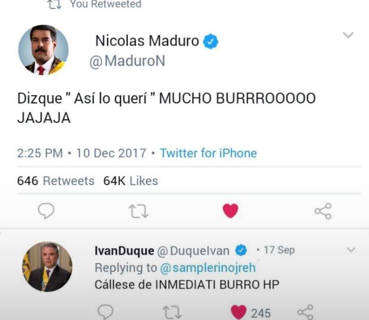 El Presidente colombiano Iván Duque Márquez esta siendo víctima de innumerables memes, o bullying cibernético donde vemos desde comparaciones con el presidente del país vecino, Nicolás Maduro, hasta referenciar los últimos errores. El saboteo virtual que es tendencia #LoQuerí (lo correcto es: lo quise) en un gobierno con más contradictores e inconformes o arrepentidos.