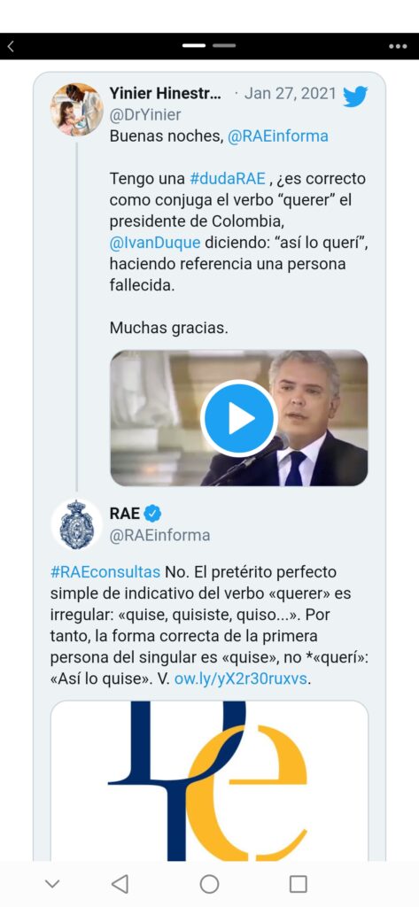 «Tengo una #dudaRAE, ¿es correcto como conjugar el verbo «querer», el predicente de Colombia @InavDuque diciendo: «asi lo querí» haciendo referencia a una persona fallecida…»