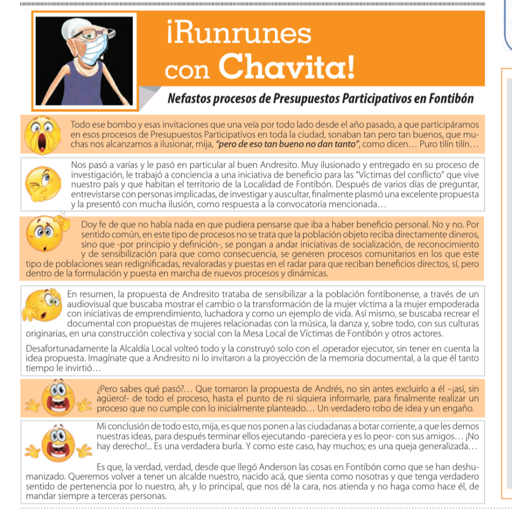 El malestar de la comunidad por la ejecución de los presupuestos participativos años 2020 y 2021, ha llevado al declive de la participación ciudadana en la localidad de Fontibón.